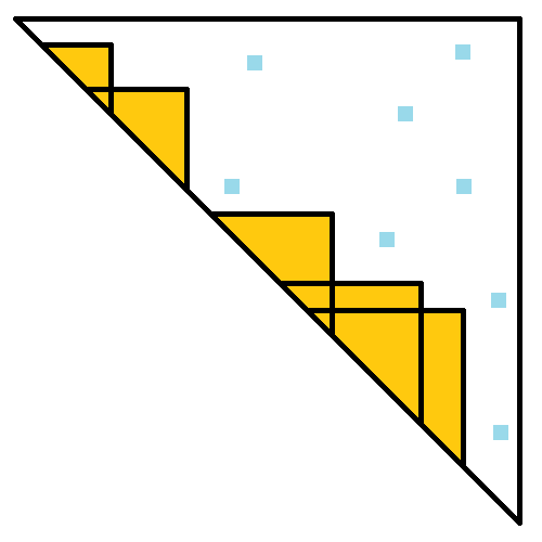 - (经典问题)(给定 个数,选出一些使和 且最大):先随意贪心选,问题转化为有正数和负数的情况,且剩余容量 。这时存在一个容易 dp 的生成方式且可以保证时刻和 : 表示考虑前 个正的,前 个负的,能否达到和 。易做到 。考虑使用判定性转最优化技巧, 表示前 个负的,和为 ,最小要考虑前几个正的可以达到。看似选正的转移需要再 1D,但实际上对于固定的 ,选第 个正的只需要在最小的 满足 处转移即可。也可以理解为 按 切片,每片的 都是右下一个阶梯形的部分,而转移只需使用阶梯的“边界”部分即可。。